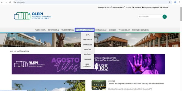 Passo 2: No topo da página inicial do site, procure a opção Atividade Legislativa