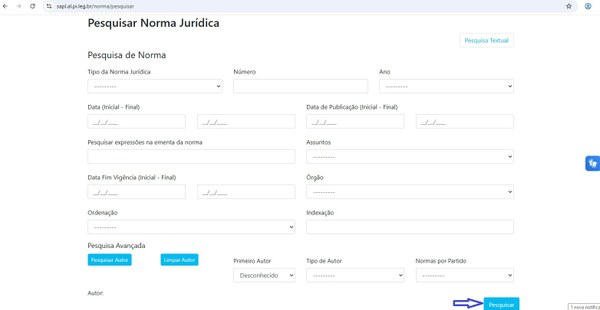 Passo 5: Essa opção permite a consulta de diversos tipos de legislações com 14 diferentes filtros. Preencha um ou mais filtros e clique em pesquisar